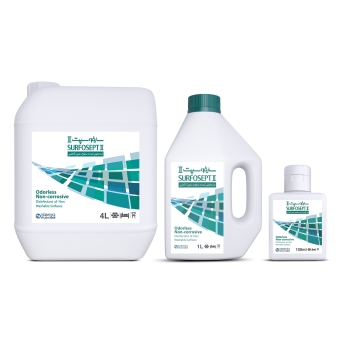 یک محلول ضد عفونی کننده کنسانتره برای ضدعفونی سطوح بزرگ محیطی غیر قابل شسشتو با آب , مبلمان و اثاثیه , سطوح بخش های حساس و اتاق های عمل و سطوح تجهیزات درمانی است. این محلول دارای پاک کننده بدون کف و سختی گیر آب جهت افزایش تاثیر گذاری ماده موثر است.